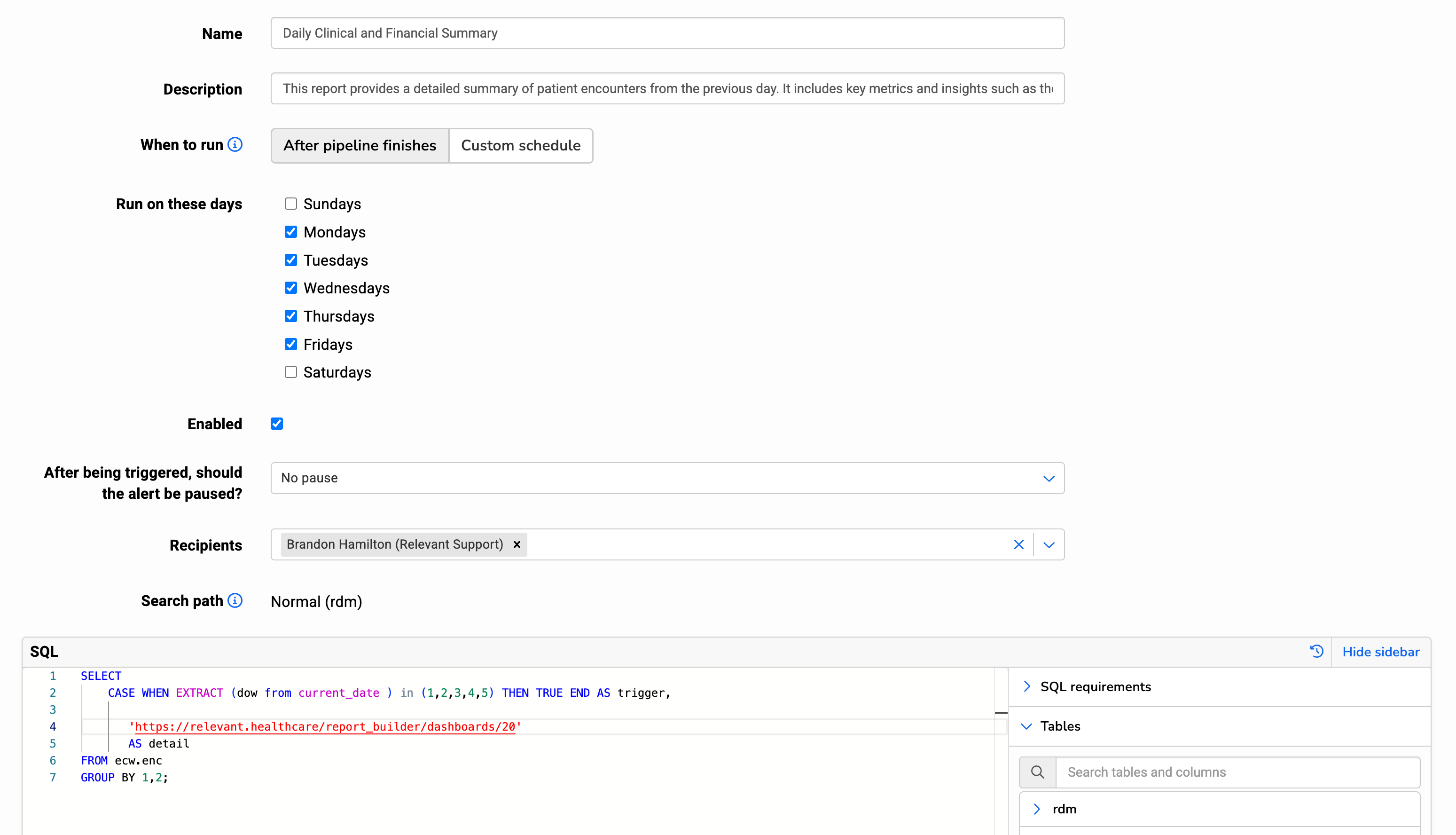trigger: a boolean, or TRUE/FALSE, value. When the alert query runs and the value oftriggeris TRUE, the alert triggers, sends an email to selected recipients, and pauses future runs of the alert query for the period of time selected.detail: a text value. This can contain any text, whether static or dynamic based on data. The detail will NOT be included in the alert email, but is accessed from Relevant through a link provided in the alert email. Therefore, it can securely contain PHI.- While the alert SQL’s final SELECT statement can only contain the above two columns, alert SQL may contain temporary tables and functions.