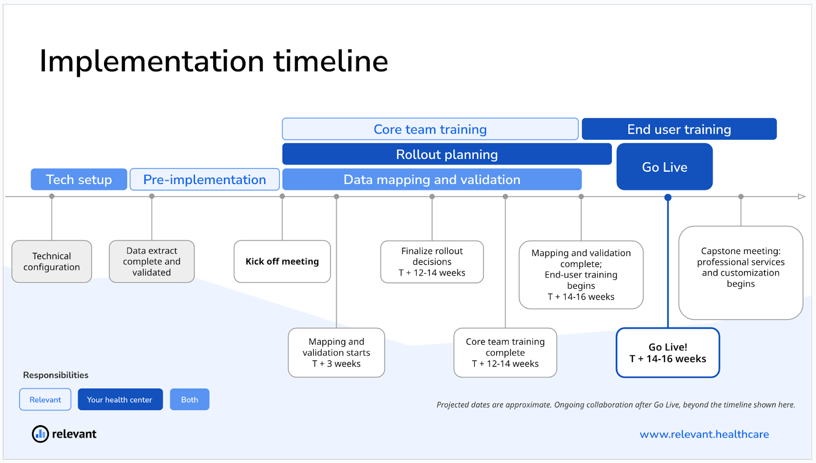 - Go-Live and Rollout planning (Weeks 9–14). Towards the end of implementation, we focus on plans for user adoption. Which staff at your health center will begin using Relevant at Go-Live, and what training will they need? Which components of Relevant will we roll out in the months following go-live, and how will we manage that adoption process effectively?