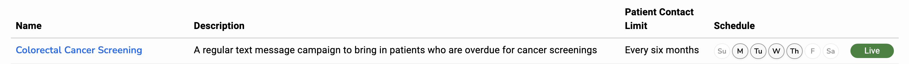 This setting determines how often to contact qualifying patients from this campaign. For example, you may schedule a campaign for cervical cancer screening to run Monday through Friday. However, you only want to text any given patient once a month, even while they remain due for cervical cancer screening. Setting the patient contact limit to “Monthly” accomplishes this.