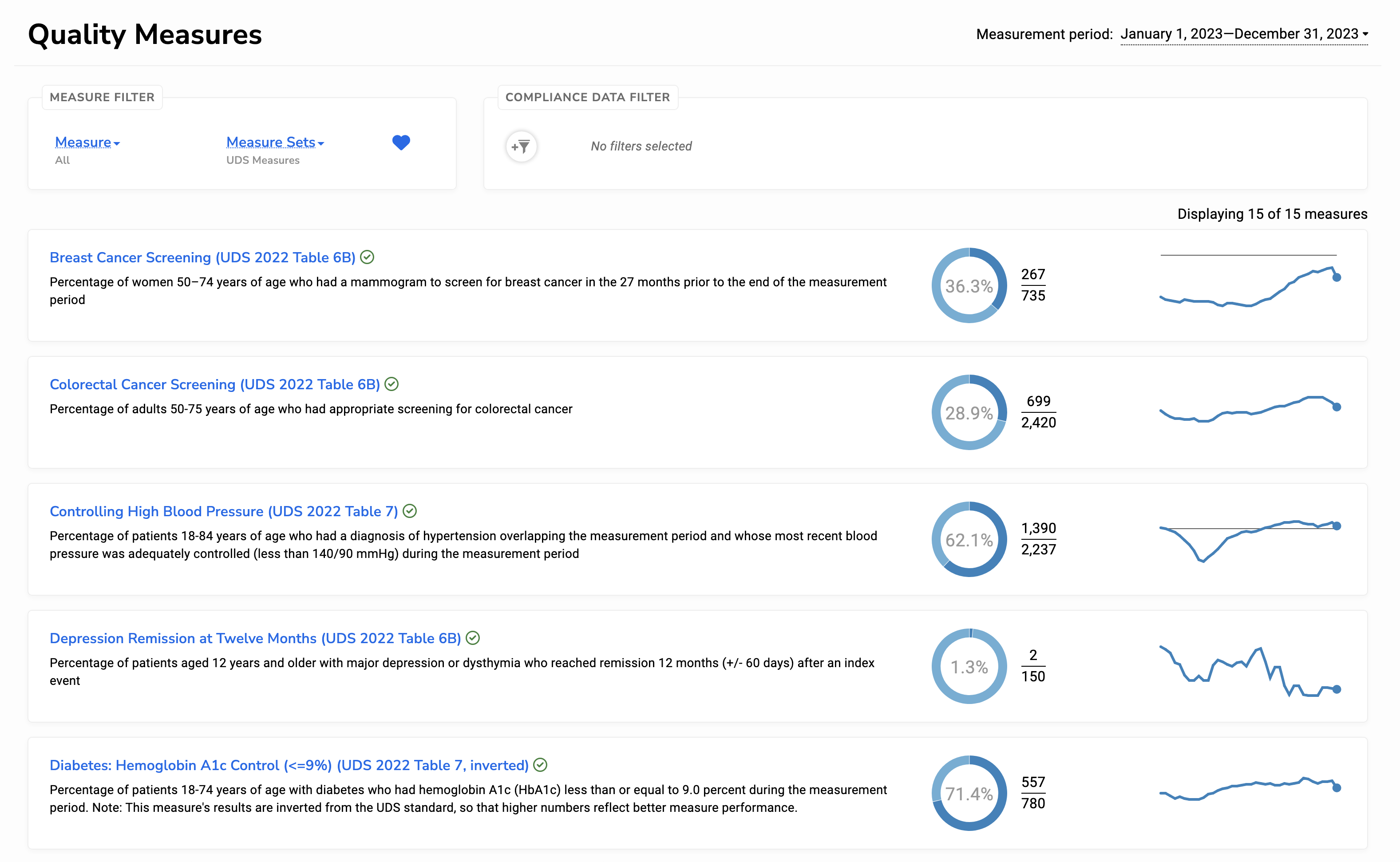 The overview screen provides a glance at all measures, including a trend line of measure compliance over the past several rolling years. This view can be filtered to specific measures and measure sets that have been configured (e.g., UDS measures, pediatric measures). Additional filters can also be applied to look at specific primary care providers, locations, and more.