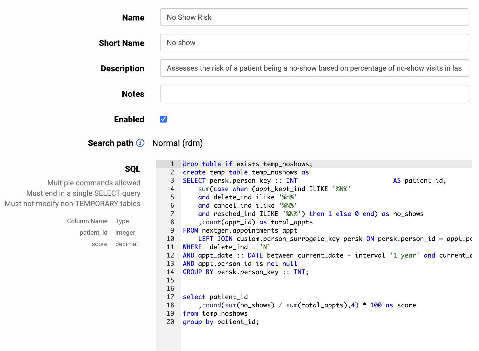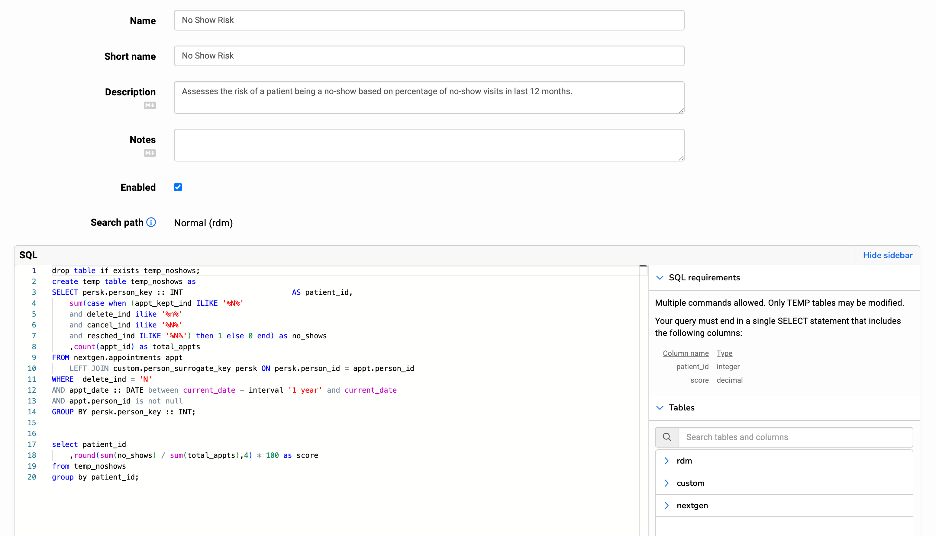 SQL-based risk models allow users to write raw SQL to stratify their patients by risk. The SQL must be a single SELECT statement and return two columns: