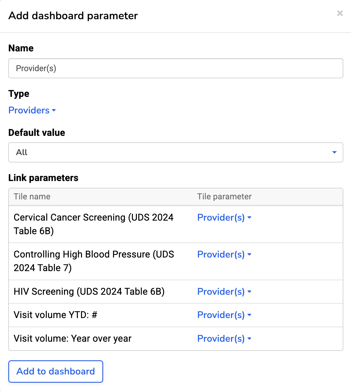 Dashboard parameters are saved in the URL so you can bookmark or share links and keep the same parameter values. This makes it easy to revisit filtered views or send others at your health center a consistent view of the data.