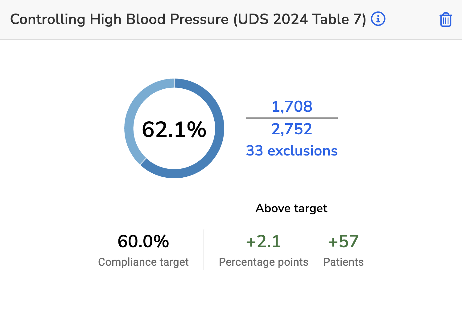 Quality Measure tiles display visualizations from the Quality Measures module. You can select any enabled, published measure to include in your Dashboard. Quality Measure filters can be linked to a shared Dashboard Parameter, however, tile-specific filters are not yet supported.