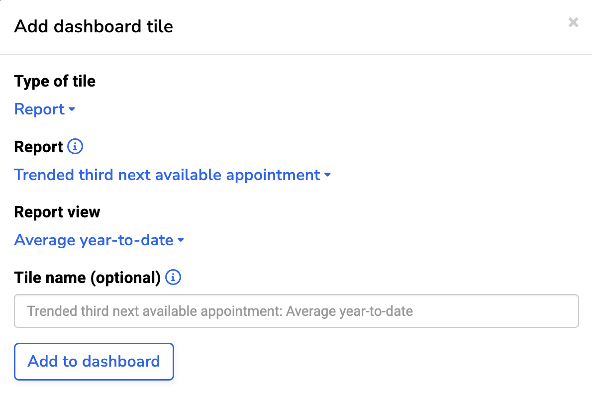 Report tiles display a single view from a “Published” or “Published (hidden)” report. You can set parameters specific to the tile or link them to a shared Dashboard Parameter for consistency across the Dashboard.