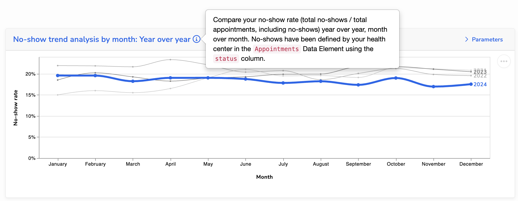 When viewing a Dashboard, you can see the source of each tile by clicking its name. The description of the Report or Quality Measure will appear in the info icon next to the tile name.