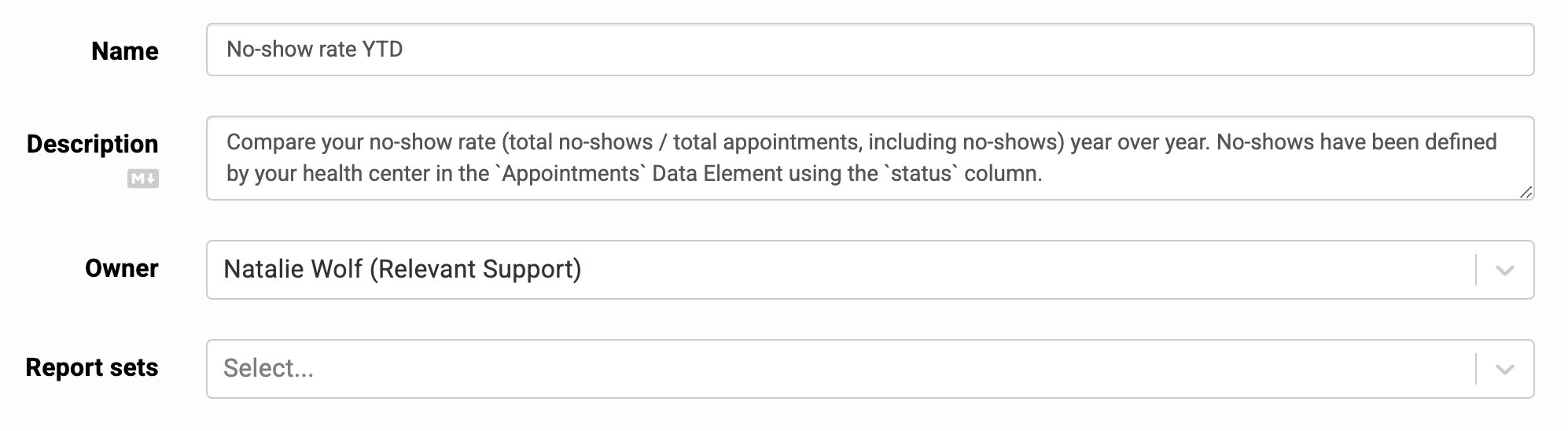 - Give the report a name and description. Note: report descriptions can be formatted with MarkDown, which allows for headings, bold text, links, images, and more.