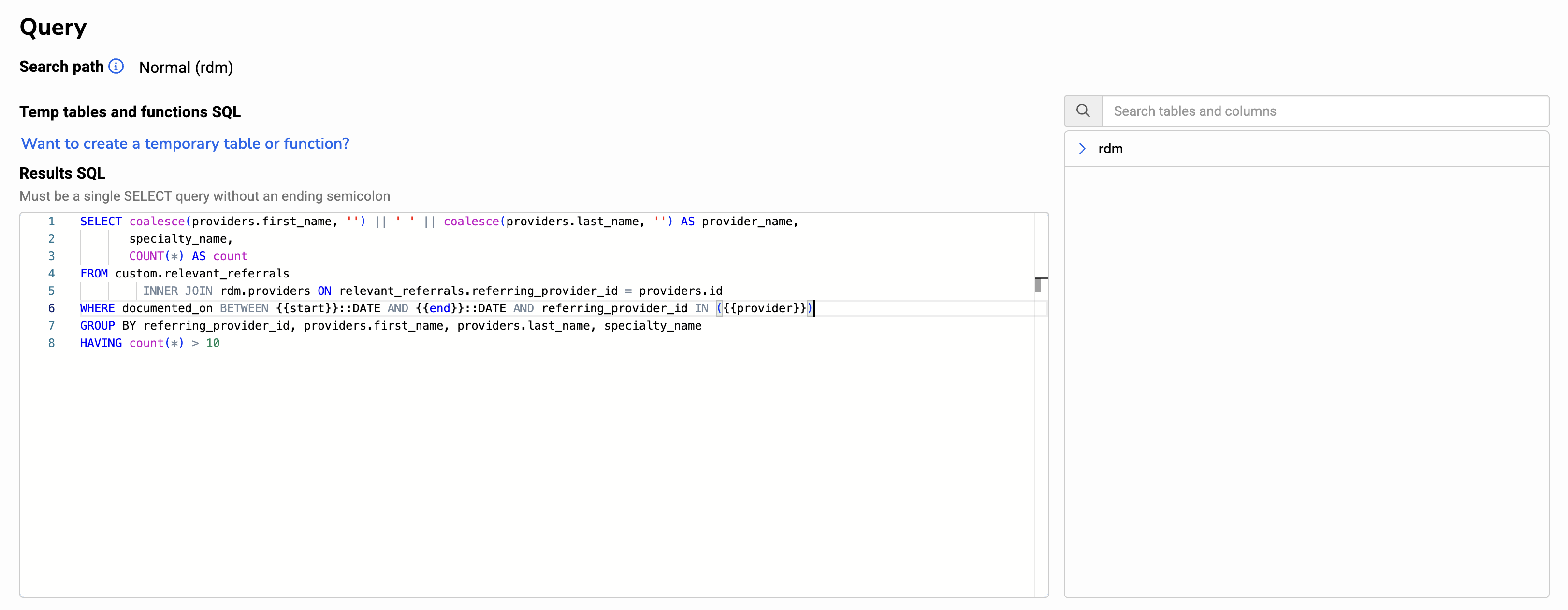 SELECTquery. Use the “Schema Browser” to reference which schemas, tables, and columns are available. - If necessary, add additional SQL commands in the “Temp tables and functions SQL” box.