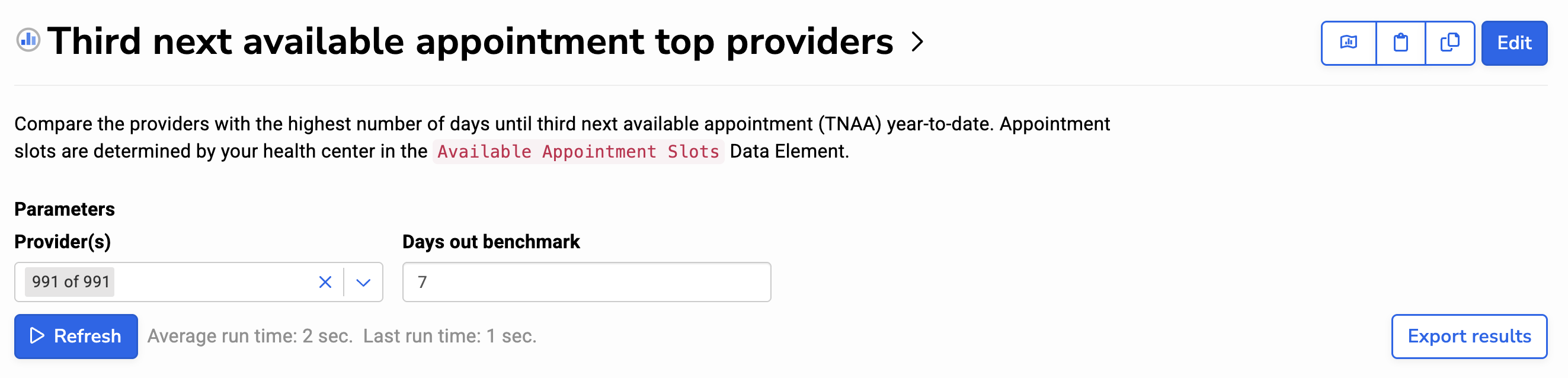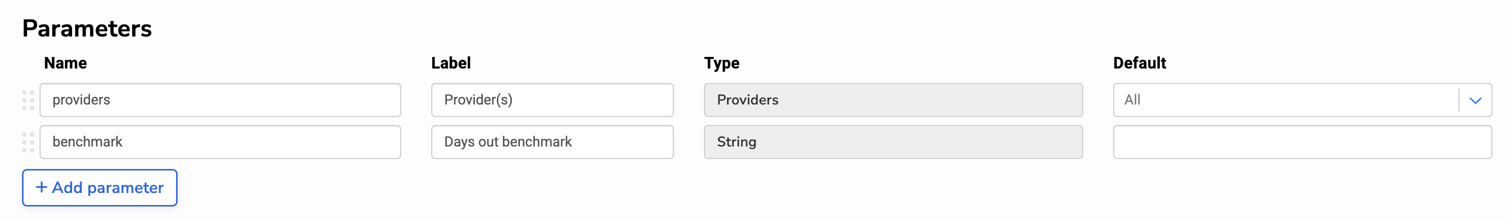 Report viewers can make use of parameters (aka “filters”) to narrow down a report’s results. Report authors control what parameters are available on a given report and how they behave. In the below example, the parameters are “Provider(s)” and “Days out benchmark.”