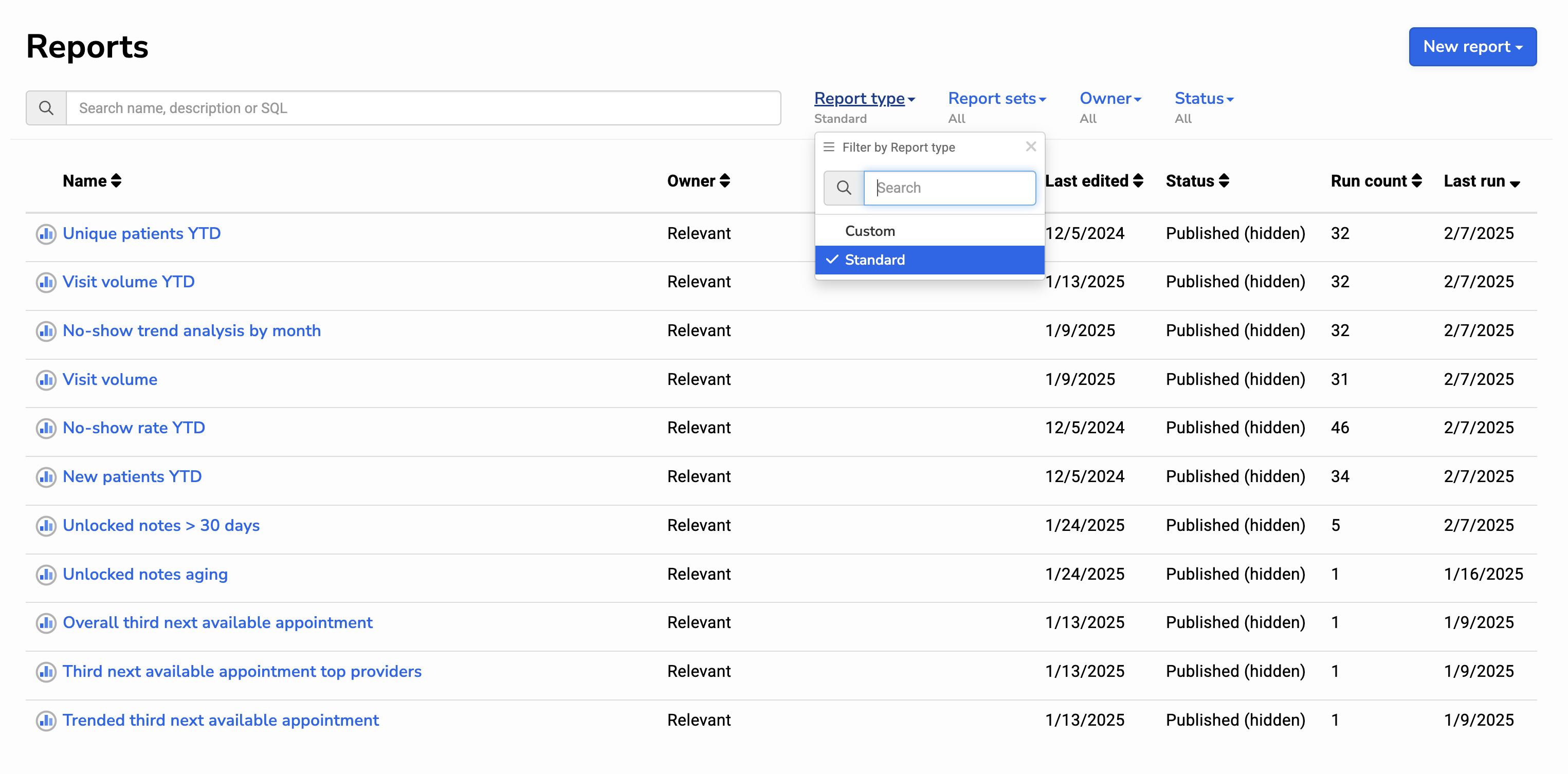 Standard reports are indicated with the Relevant logo on the reports page. To quickly find them, you can filter by “Report type” to only display standard reports (note that you may need to update the “Status” filter as well to see all standard reports). These reports function just like any other report in Relevant–you can: run the report, use parameters to refine the data, export results, and view the SQL powering the report. Learn more about Reports.