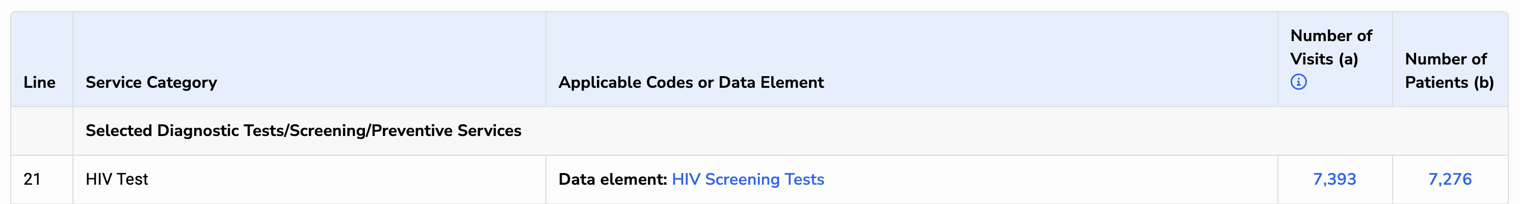 For rows powered by Data Elements, the “Number of Visits” column is calculated as the number of rows in the Data Element with a performed_on date during the reporting year (provided that the patient had a countable UDS visit at any time during the reporting year).