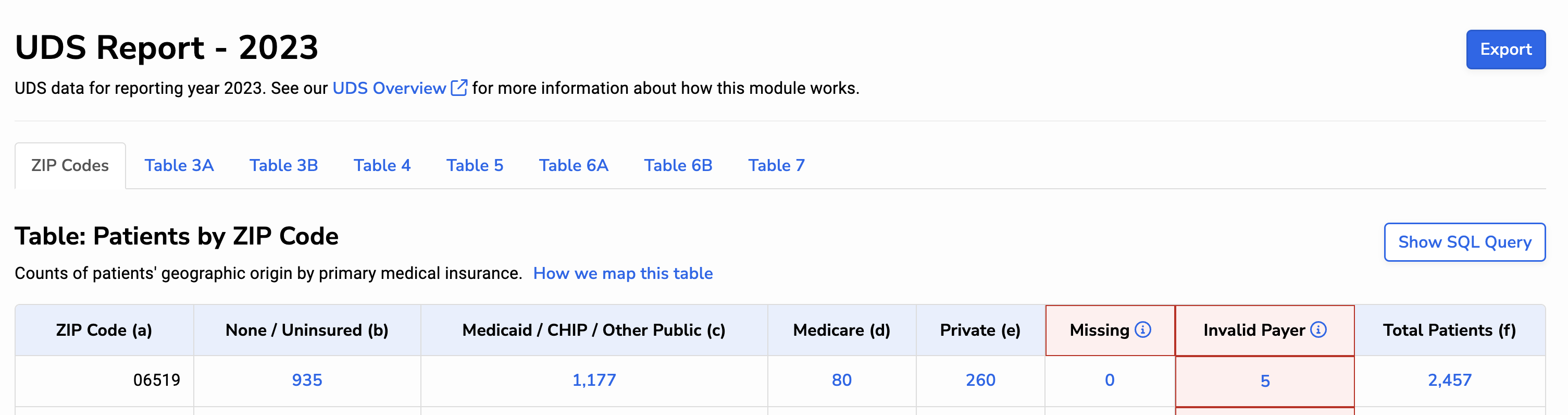 - The “uds_patients” contains all of the data for the first four UDS tables. More than a dozen additional tables are used to capture the data in Tables 5, 6A, 6B, and 7.