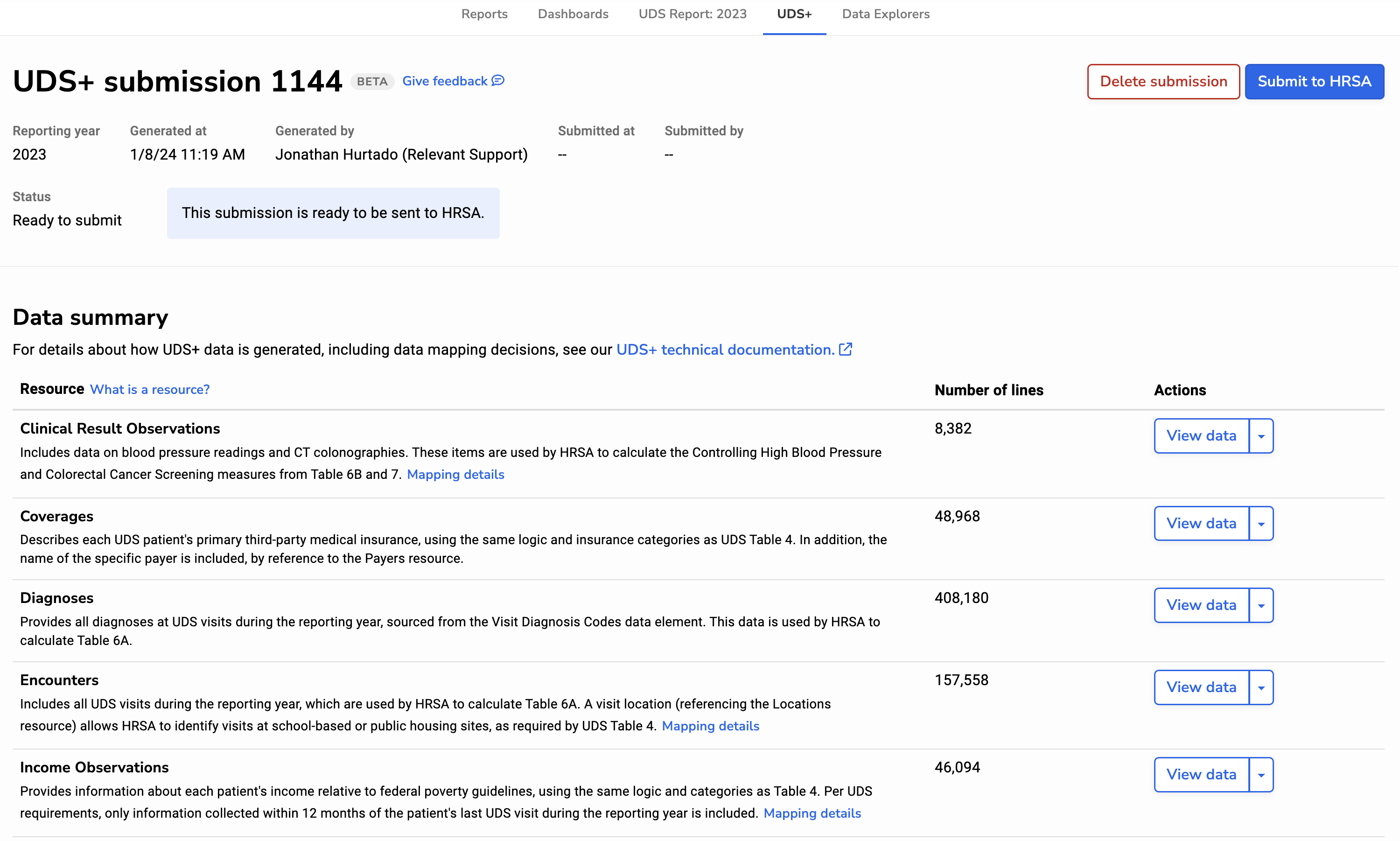 Within Relevant, you can create a UDS+ submission, explore its contents, and submit directly to HRSA. Here’s what a submission looks like: