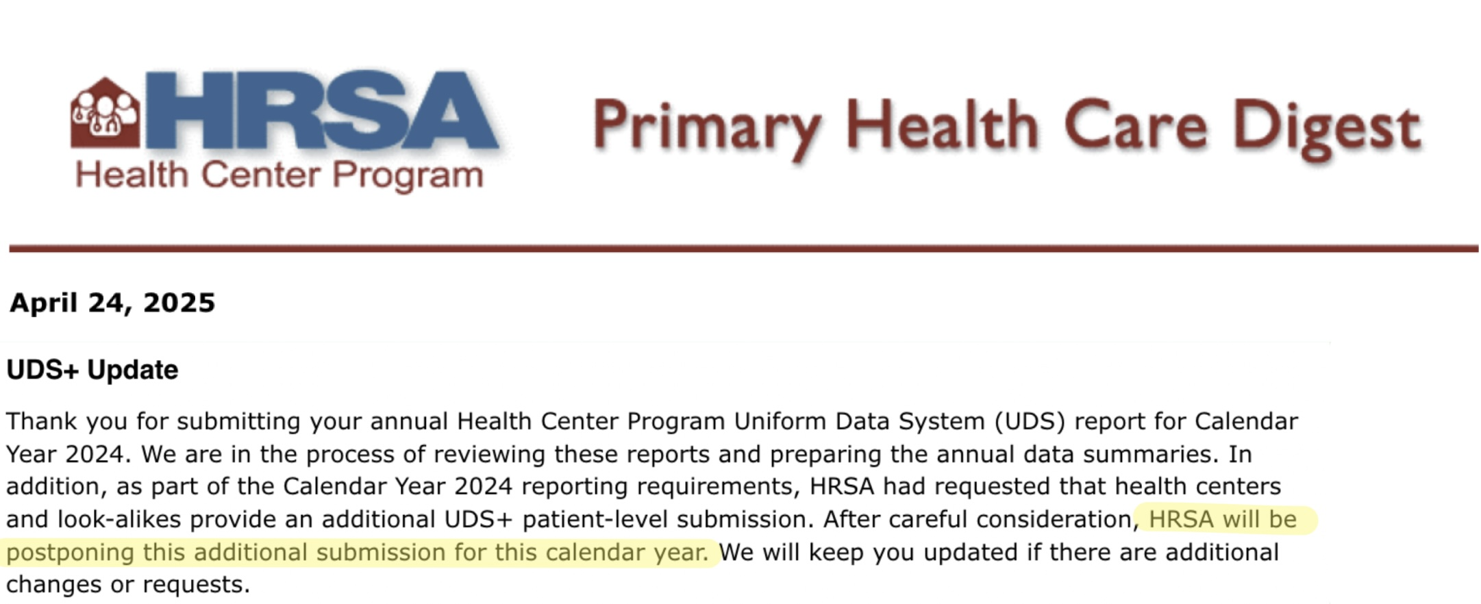 This page was last updated on April 24, 2025. Please check back for the latest information, as HRSA’s plans for UDS+ continue to evolve.